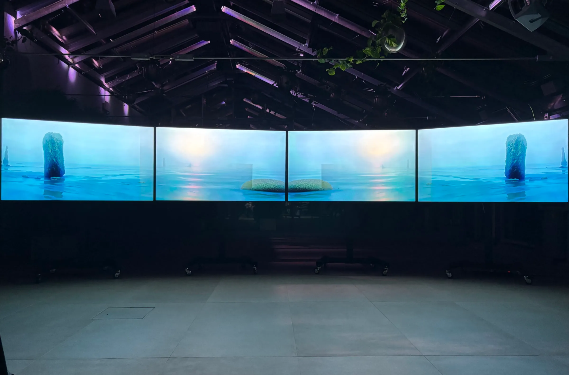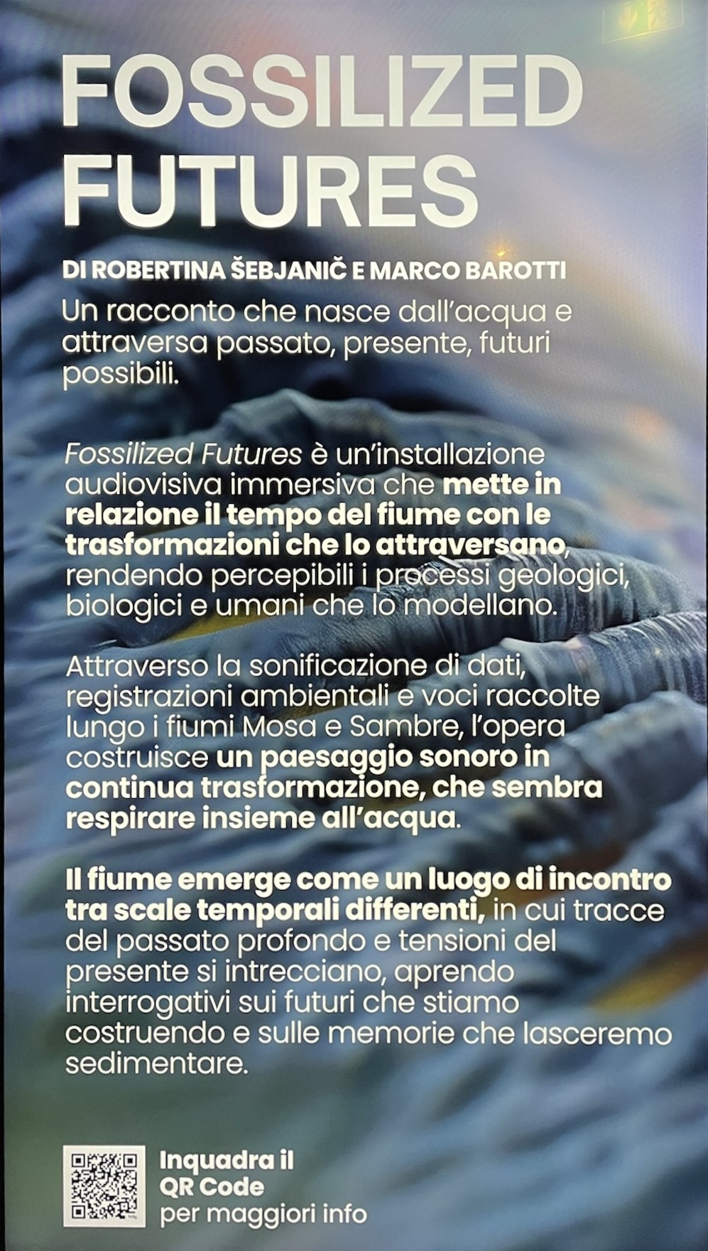 Fossilized Futures moves within the temporality of the river , a time that does not proceed linearly but accumulates and settles, building a layered memory made of biological sediments, human histories, and geological processes. It is in this dimension that the multichannel sound score takes shape, generated by the sonification of river data, environmental recordings, and choral voices collected along the Meuse and Sambre rivers , composing a soundscape that seems to breathe with the water.